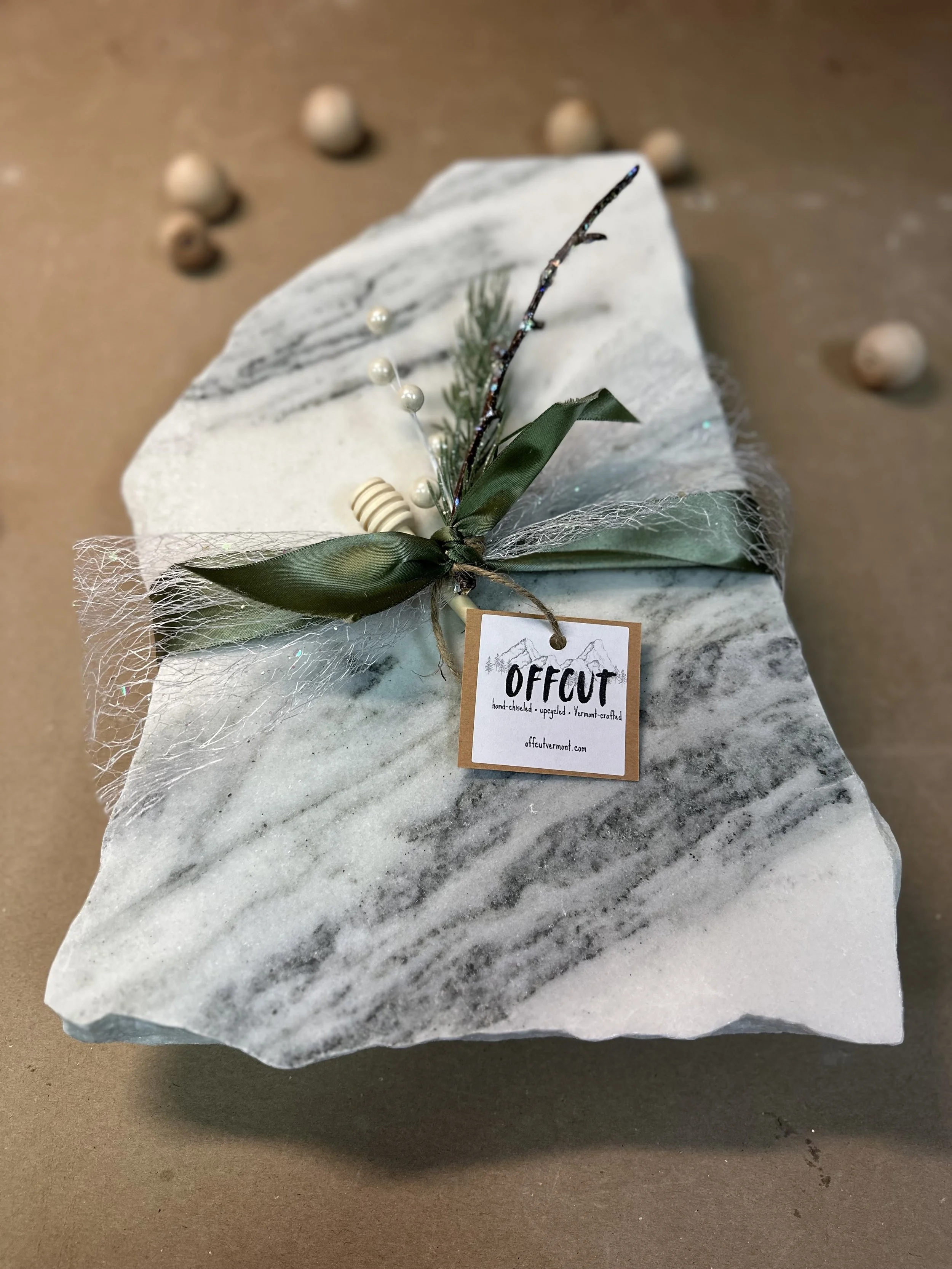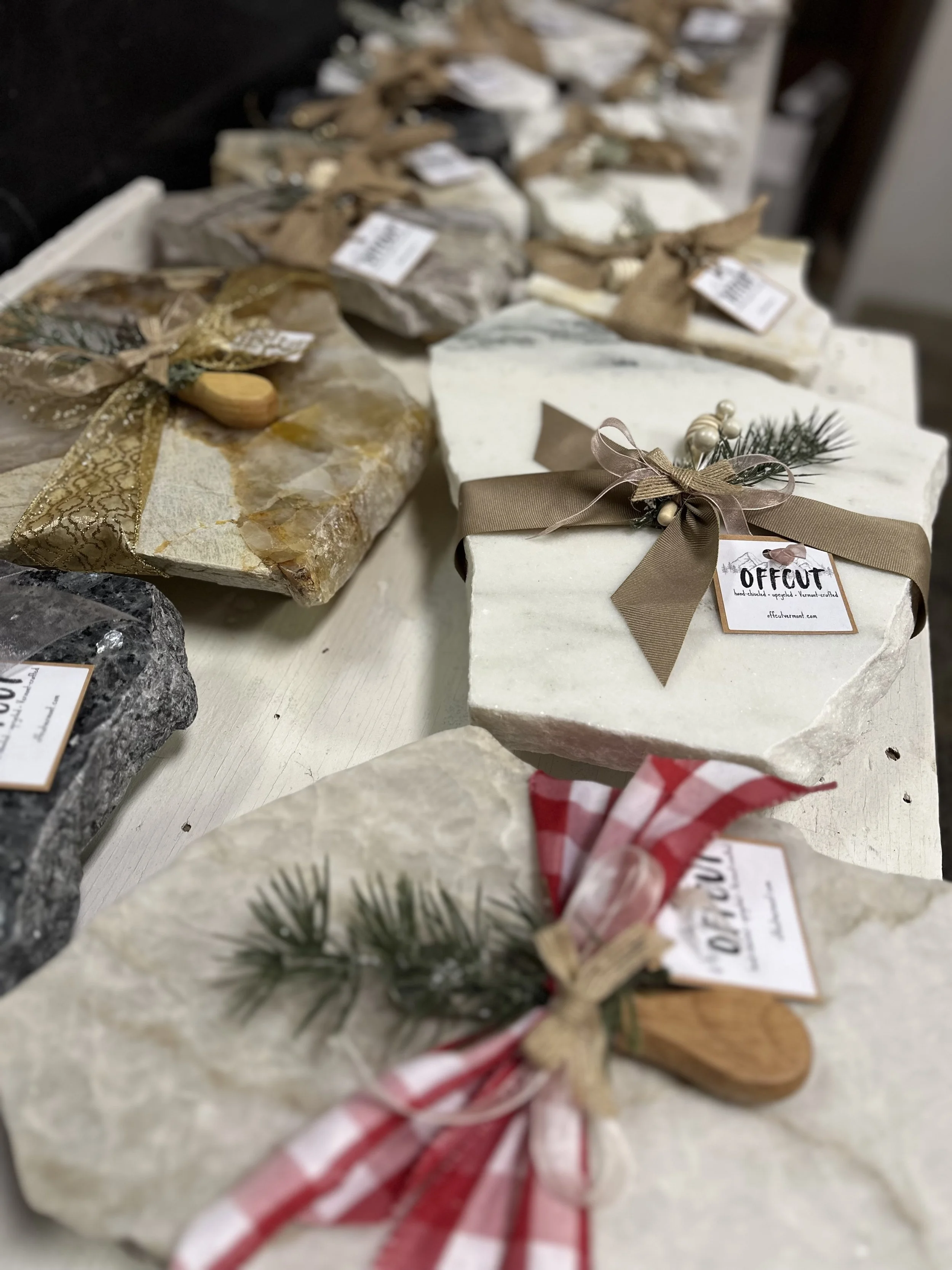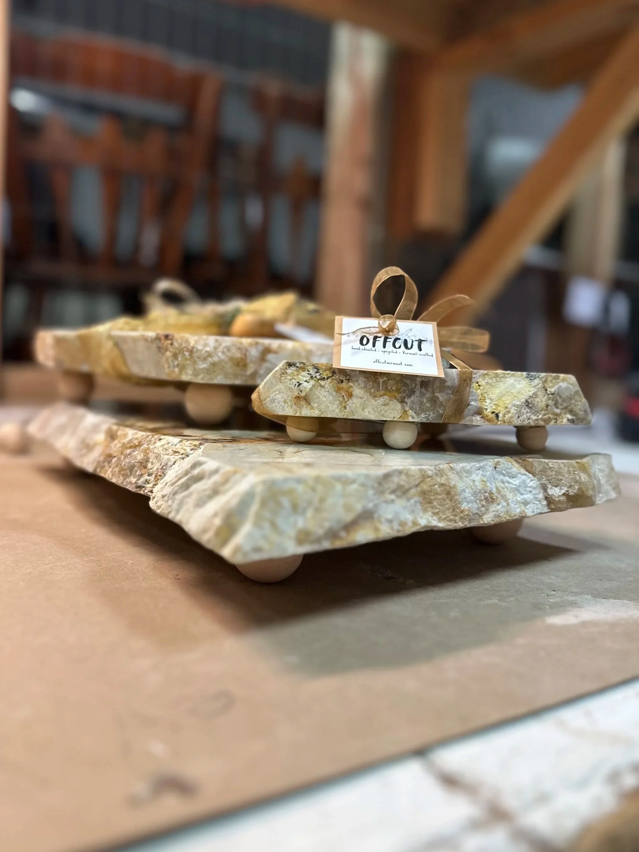 We supply hand-chiseled stone display boards to boutiques, farm stores, galleries, and gift shops across Vermont and beyond. Each order is built from our current stone inventory — no two batches are exactly alike, which means your shelves always have something unique.